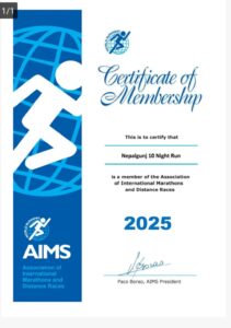 नेपालगञ्ज । नेपालमा रातमा आयोजना हुने एक मात्र १० किलोमिटर दूरीको ‘नेपालगन्ज नाइट रन’ अब विश्व दौड मञ्चमा पहुँच बनाउँदै एसोसिएसन अफ इन्टरनेशनल म्याराथन एण्ड डिस्टेन्स रेस (एम्स) मा औपचारिक रूपमा आबद्ध भएको छ।